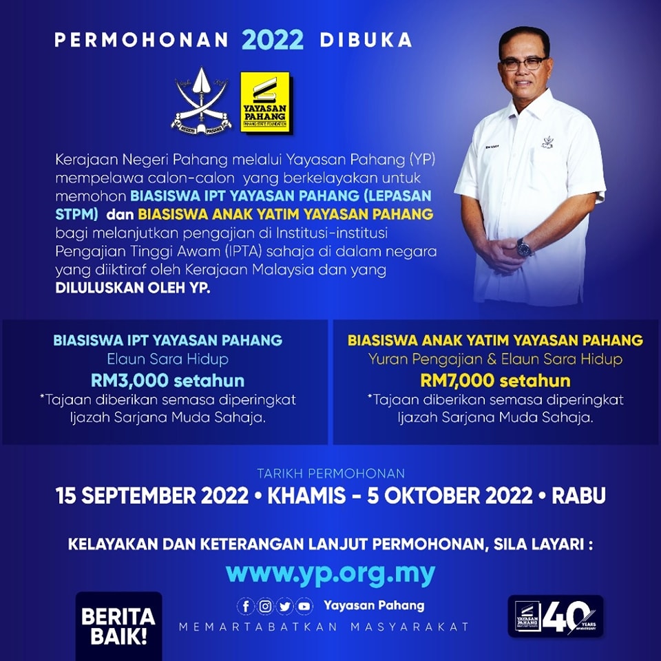 MAKLUMAT BIASISWA Skim Pembiayaan Biasiswa Yayasan Pahang diwujudkan bertujuan untuk memberi pembiayaan pendidikan kepada pelajar yang layak tetapi tidak berkemampuan untuk mengikuti pengajian Sekolah Rendah dan Menengah serta di Institusi Pendidikan Tinggi Awam dan Swasta. Ketahui info mengenai Institusi dan cara memohon secara langsung. Iklan jawatan kosong personel My Step juga akan disiarkan dari semasa ke semasa oleh agensi yang mempunyai kekosongan.